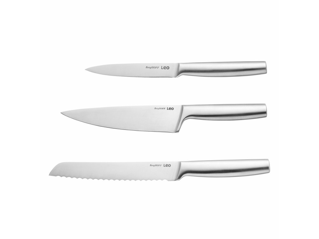Táto 3-dielna sada obsahuje praktický nôž, nôž na chlieb a kuchársky nôž, perfektná súprava štartovacích nožov do vašej kuchyne! Všestranný kuchársky nôž je na krájanie a krájanie na kocky, nôž čisto reže potraviny s tvrdým povrchom a mäkkým vnútrom a nôž na chlieb krája chlieb na rovnomerné plátky pre dokonalý začiatok dňa.