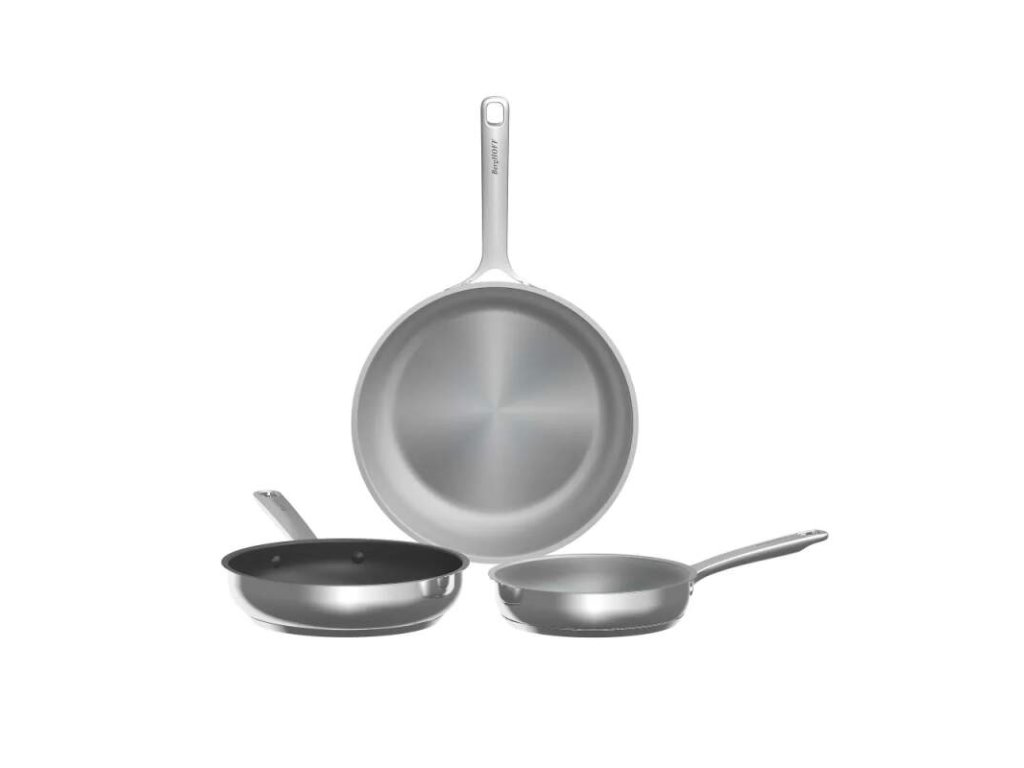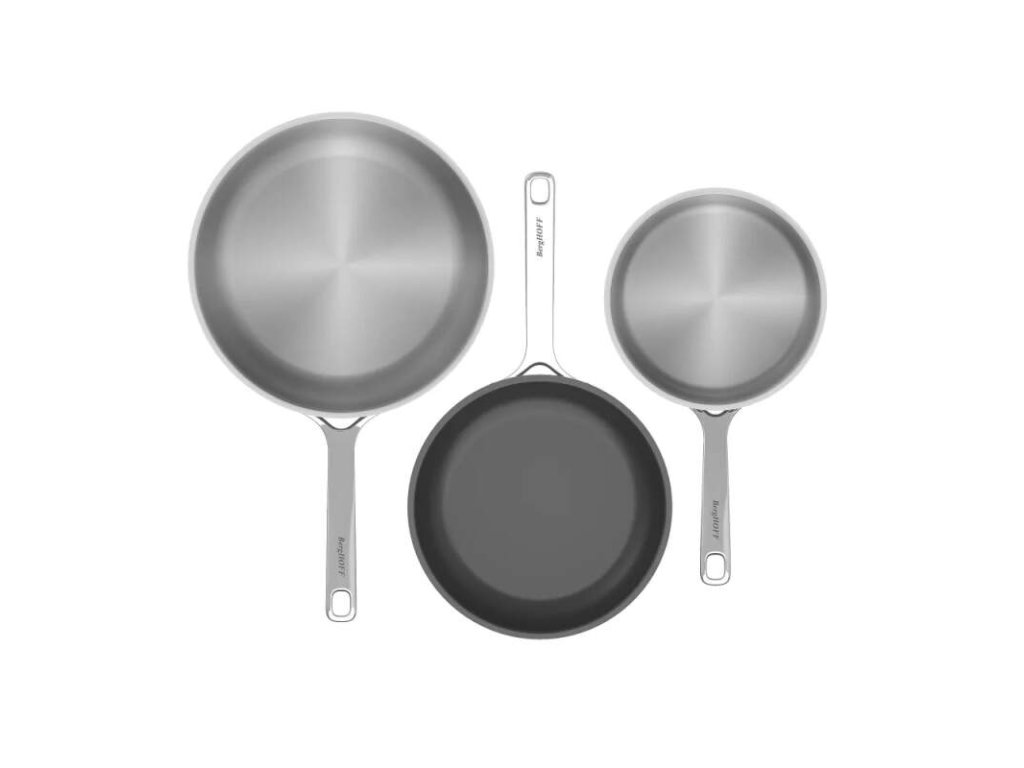 Táto sada obsahuje 3 panvice (20,00 cm, 24,00 cm a 28,00 cm) vyrobené z recyklovanej nehrdzavejúcej ocele so štýlovým saténovým povrchom. Panvica s priemerom 24,00 cm je vybavená keramickým nelepivým povlakom CeraGreen, ideálnym na varenie s minimom alebo bez oleja a na jednoduché čistenie. Všetky panvice je možné vložiť do rúry do 230,00°C.