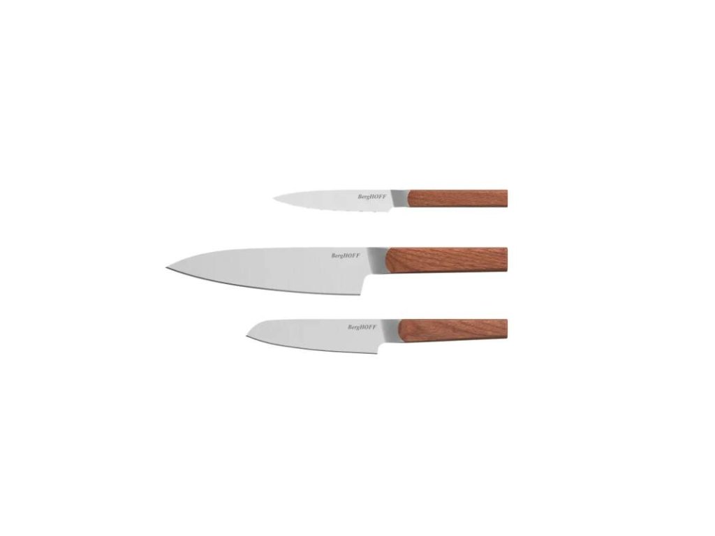 Tento 3-dielny set obsahuje zúbkovaný univerzálny nôž, kuchynský nôž a nôž Santoku, ideálny štartovací nôžkový set pre vašu kuchyňu! Všestranný kuchynský nôž je určený na krájanie a kockovanie, zúbkovaný univerzálny nôž reže čisté jedlo s tvrdou vonkajšou a mäkkou vnútornou časťou a nôž Santoku je perfektný na krájanie, rezanie a kockovanie ingrediencií. Štýlové drevené rukoväte so saténovým povrchom vám poskytujú bezpečný a pohodlný úchop a zároveň pridávajú ten extra lesk, ktorý hľadáte!