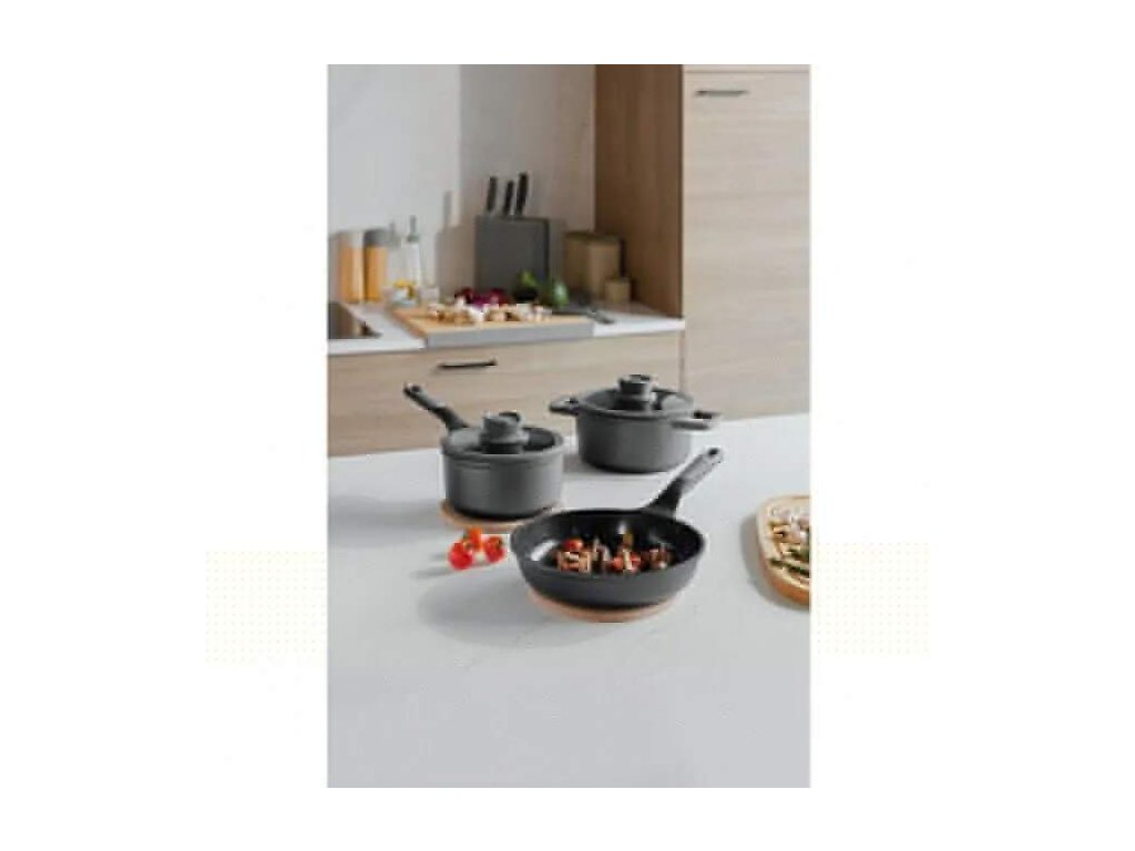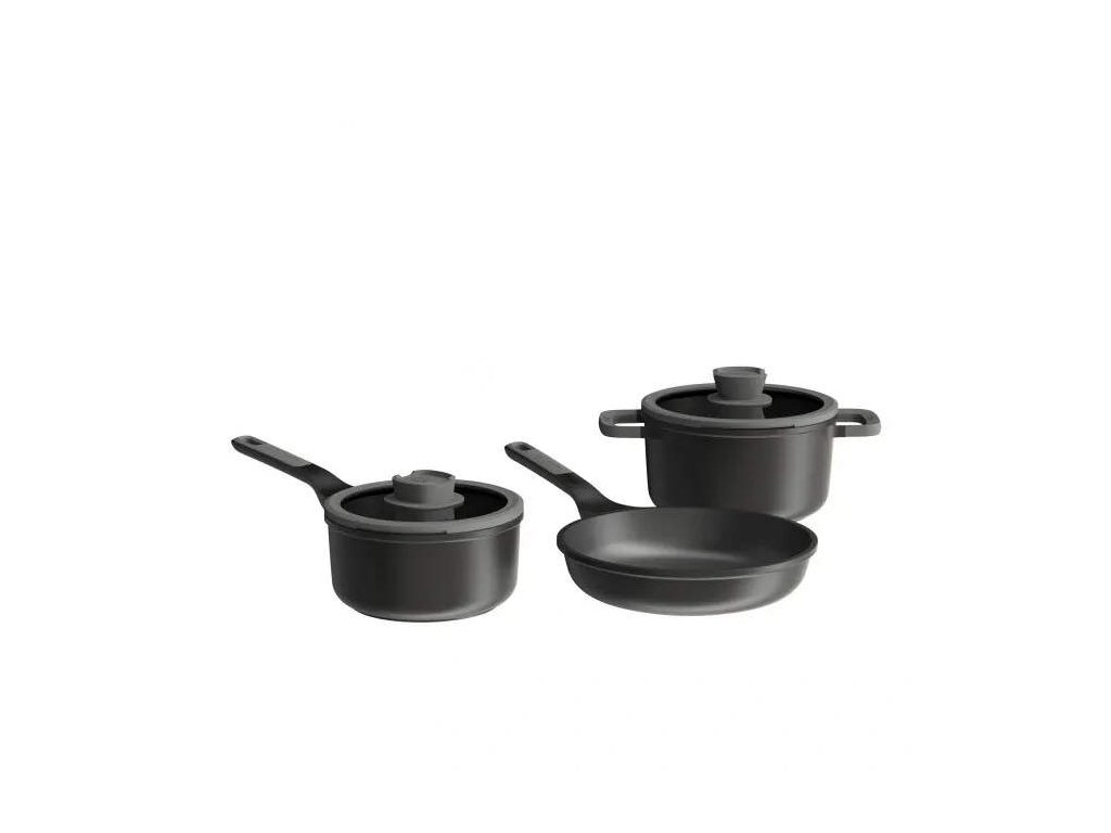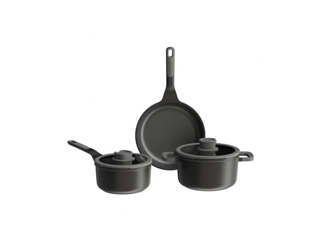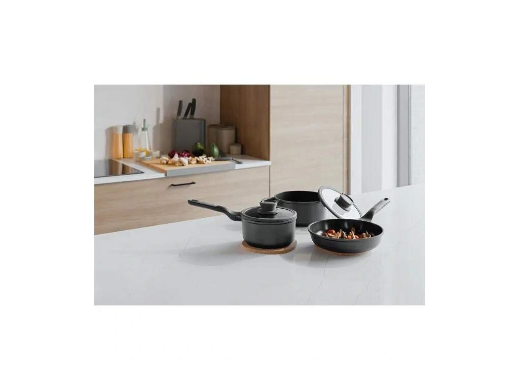 Varte s istotou s touto univerzálnou 5-dielnou sadou riadu. S rajnicou (18 cm) s pokrievkou, hrncom (20 cm) s pokrievkou a panvicou (24 cm) bez pokrievky vám táto sada umožní pripraviť širokú škálu receptov. Táto sada riadu je vyrobená z recyklovaného liateho hliníka, ktorý zabezpečuje skvelý a rovnomerný prenos tepla. Štýlové čierne telo má zdravý a udržateľný nepriľnavý povrch, ktorý umožňuje ľahké uvoľnenie jedla a jednoduché čistenie, pričom vyžaduje použitie len malého množstva oleja alebo úplne bez neho. Sklenená pokrievka so silikónovým okrajom zabraňuje klopaniu a pomáha vám sledovať prípravu jedla. Integrovaný odvzdušňovač a cedník robia hrnce vhodnými pre všetky typy varných dosiek, vrátane indukcie a odvetrania. Držiak na lyžicu na úchytke zabezpečuje čisté varenie.
