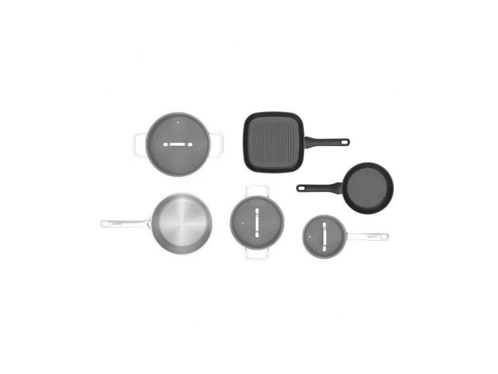 Táto sada obsahuje kombináciu hrncov a panvíc s telami z recyklovanej nerezovej ocele a telami z recyklovaného hliníka s keramickým povlakom. Sada obsahuje hrniec na omáčku, 20 cm a 24 cm hrnce a 24 cm panvicu, ktoré sú vyrobené z recyklovaného nerezového ocele s elegantným saténovým povrchom. Kapsulová základňa distribuuje teplo rýchlo a rovnomerne po celej ploche na akomkoľvek type sporáka, vrátane indukcie. Priehľadné sklenené pokrievky hrncov majú okraj z nerezovej ocele a integrovaný ventilačný otvor, vďaka ktorému môžete monitorovať obsah. Všetky tieto položky sú vhodné do umývačky riadu. 20 cm nelepivá panvica a 24 cm grilovacia panvica s nelepivým povrchom sú vyrobené z recyklovaného hliníka a majú keramický a zdravý povlak CeraGreen, ktorý vám umožňuje variť s minimálnym alebo žiadnym použitím oleja. Tento povlak tieto panvice ľahko čistí, ale nie sú vhodné do umývačky riadu.