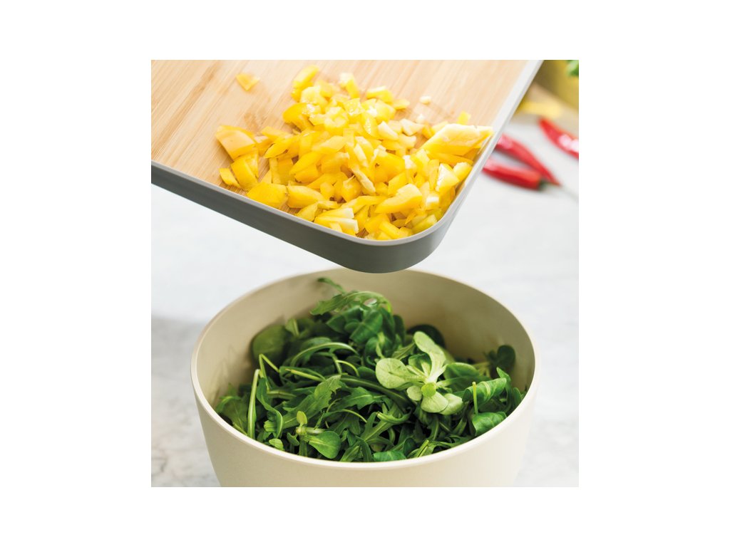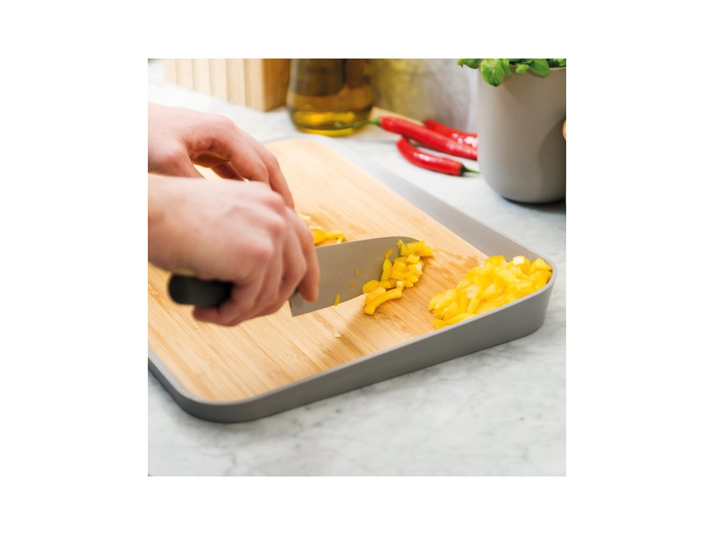 Doska na krájanie je jednou z najdôležitejších pomocníčok v kuchyni. Je z bambusového dreva , ktoré veämi rýchlo rastie a preto sa radí medzi obnoviteľné zdroje. Zároveň je perfektnou náhradou za drevo a je láskavejší k nožom, pretože netupia ich čepele. Bambus je prirodzene antibakteriálny a absorbuje veďmi malú vlhkosť, takže je hygienickejší ako niektoré iné druhy dreva. Povrch dosky je ošetrený olejom a okraj dosky je pogumovaný, aby sa pri práci nešmýkala a vy ste mohli na nej bezpečne pracovať. Okraj je z jednej strany vyvýšený na zhrňanie a jednoduchým prekladaním nakrájaných kúskov.