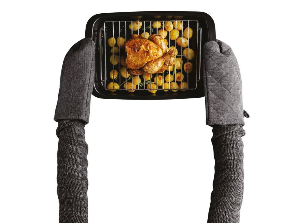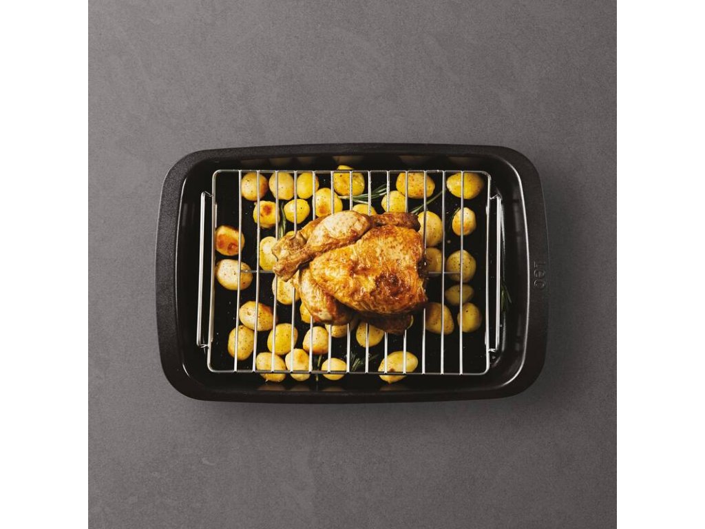 CeraGreen od BergHOFF, 100% netoxický, udržateľný a zdravý, bez PFAS, nepriľnavý povrch vyrobený z prírodných surovín pre zdravšie varenie bez oleja alebo s nízkym obsahom oleja. Všestranná varná plocha na rýchle grilovanie a opekanie potravín pri vysokých teplotách. Odnímateľný stojan je ideálny na pečenie moriaka, kuracieho mäsa, šunky.