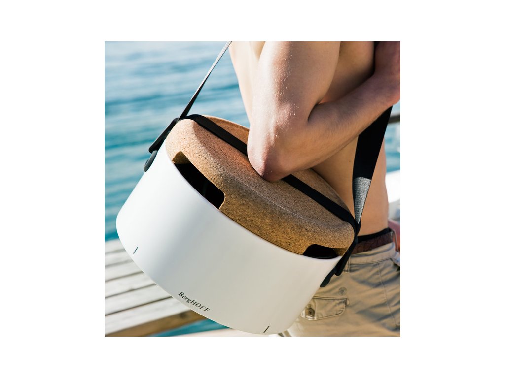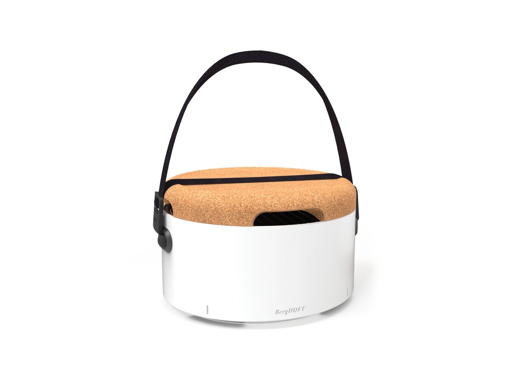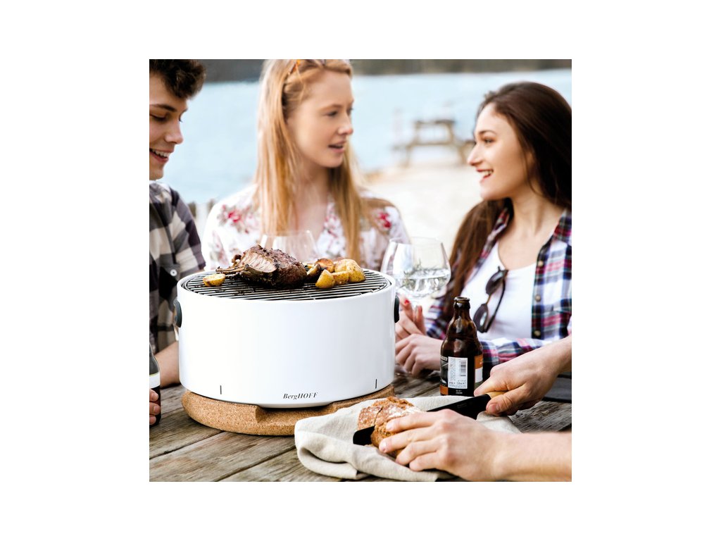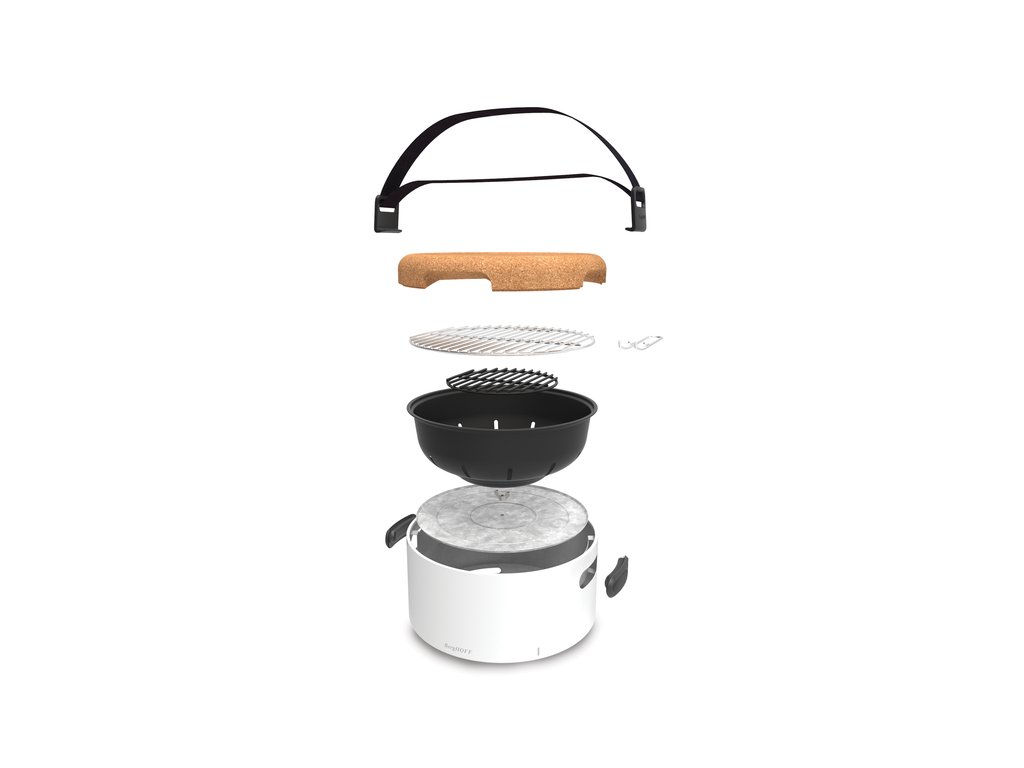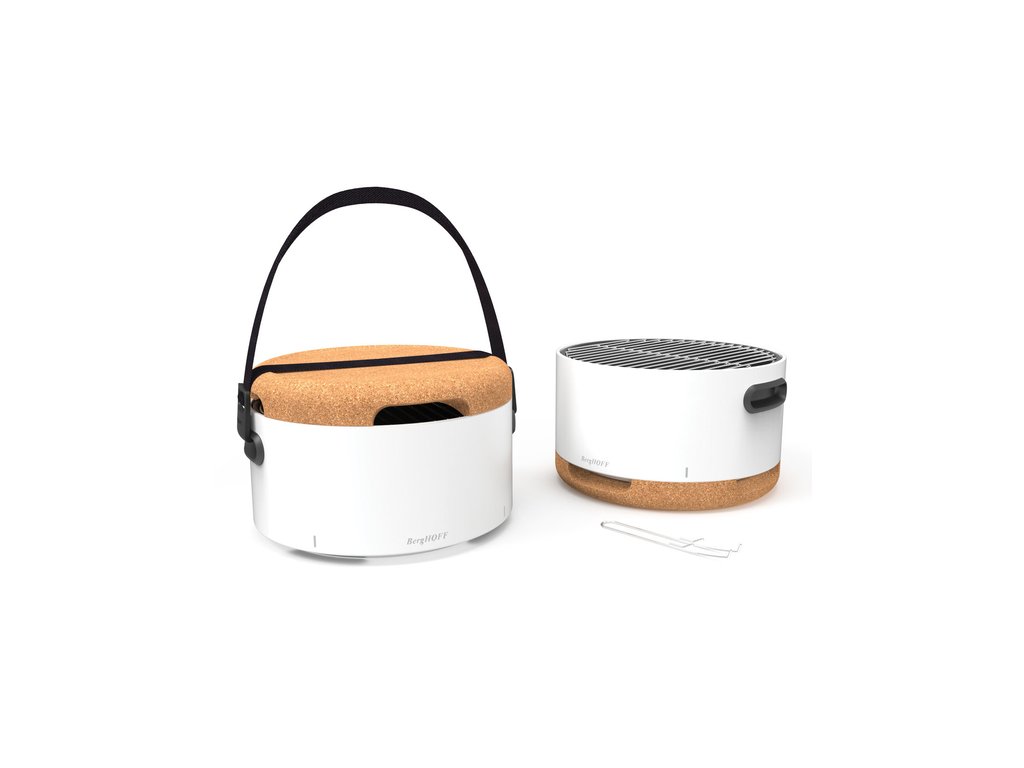 Gril Je vyrobený z ocele v bielej práškovej farbe a so silikónovými úchtymi. Rošt je z pochrómovanej ocele a popruh je vyrobený z polyesteru. Výška: 22 cm. Priemer 35 cm Hmotnosť 5 kg.