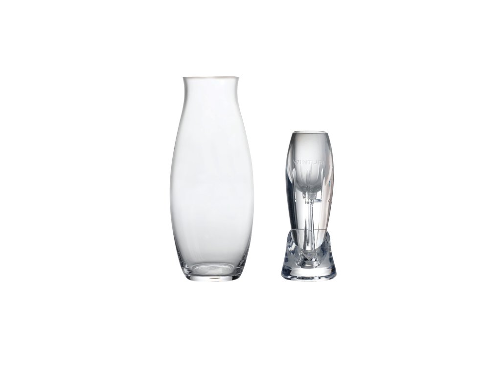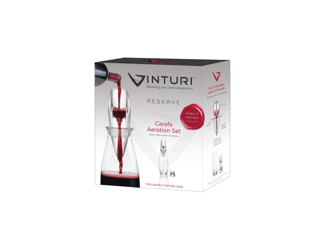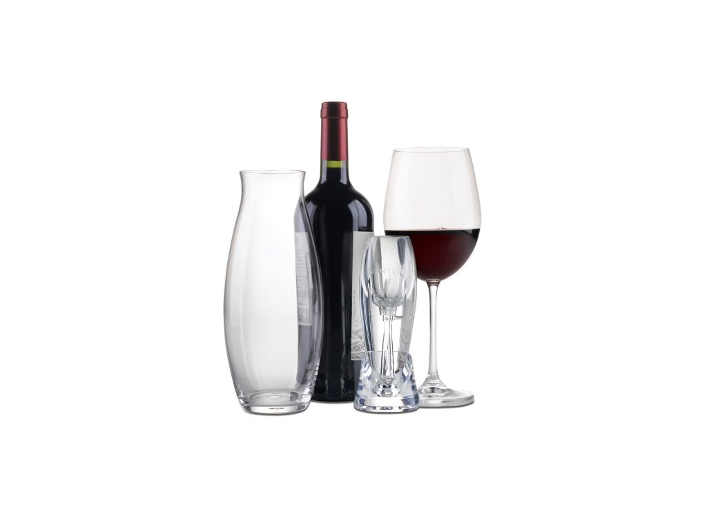 Vínny set, ktorý obsahuje aerátor na prevzdušnenie vína, stojan, karafu a krúžok pre aerátor. Takto si môžete víno prevzdušniť priamo do pohára alebo rovno celú fľašu vliať cez aerátor do karafy, ktorá sa stane reprezentatívnym kúskom pre vašich hostí.