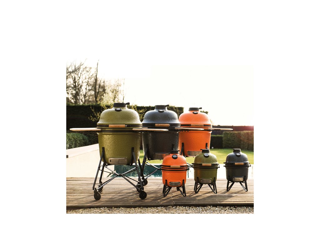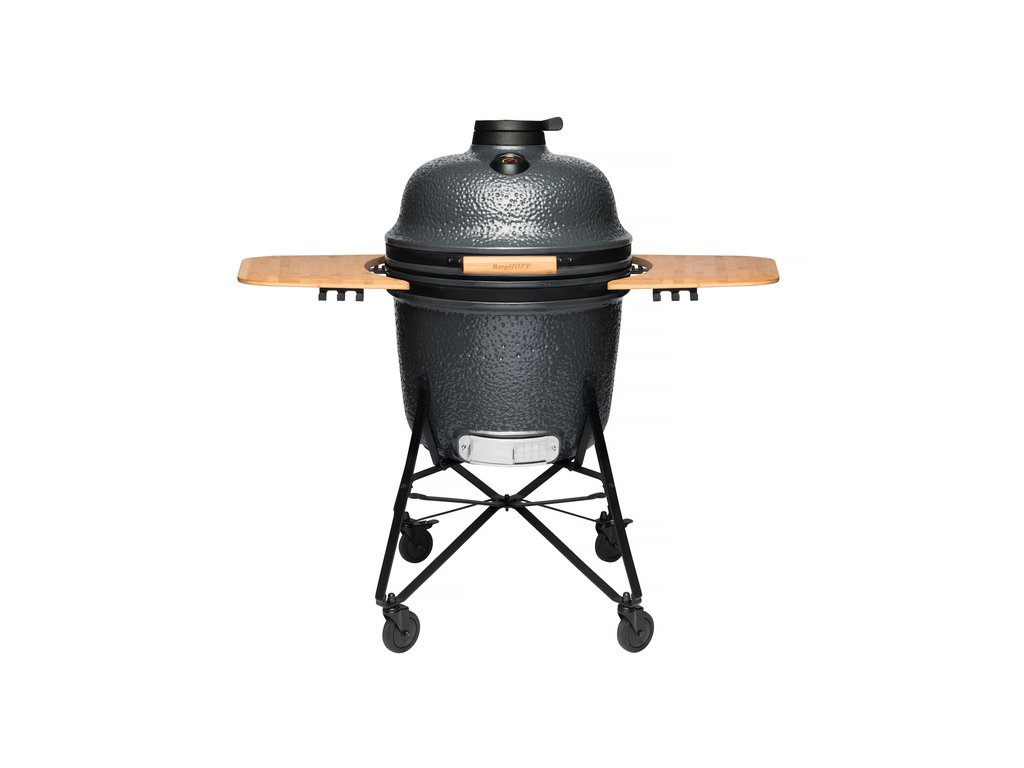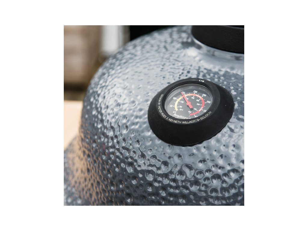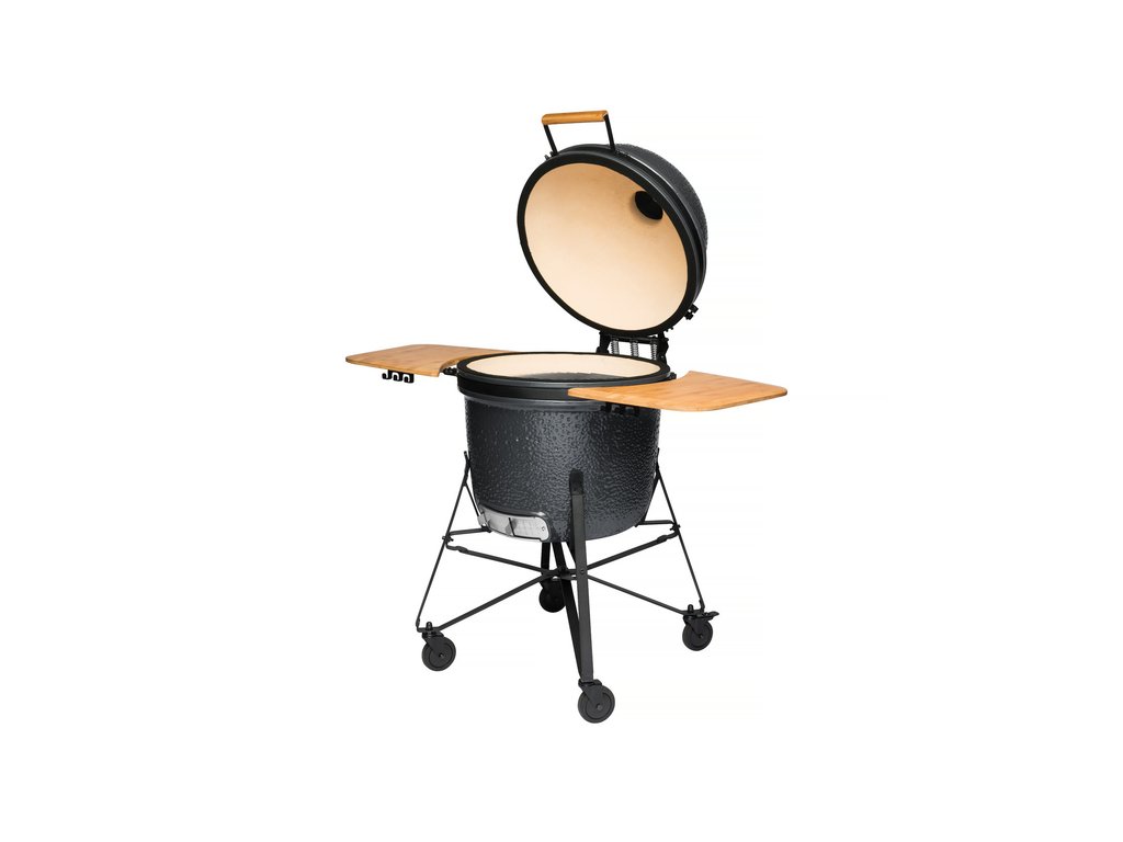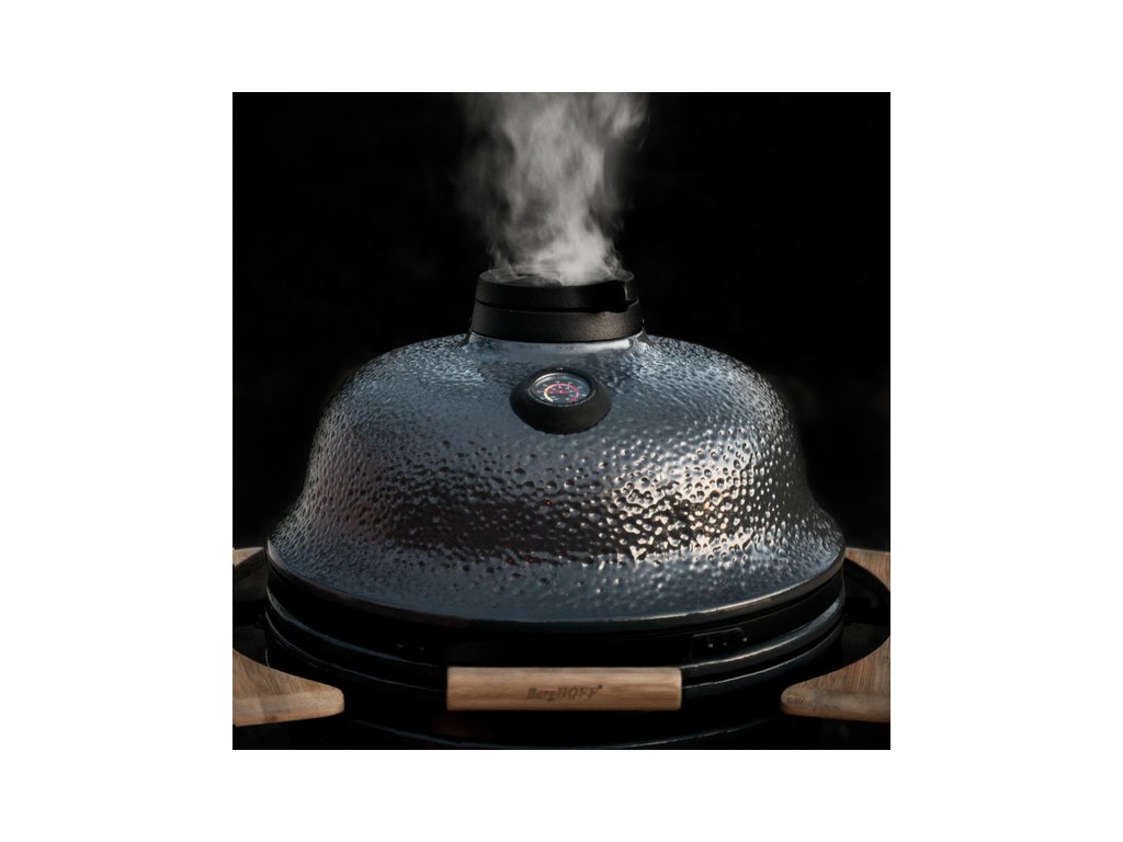 Vybehnite von na terasu a urobte si grilovaciu párty so svojimi priateľmi. Najviac si to odmaká tento gril a verte, že nańo sa môžete spoľahnú. Má keramický povrch, ktorý to vie naozaj rozpáliť na pečenie a grilovanie. V grile je možné aj údiť nastavením nízkej teploty. Jeho guľatá konštrukcia sa postará o správnu cirkuláciu tepla pre rýchle a rovnomerné pečenie. Vrchná sklopná časť má v strede umiestnenú ventiláciu a teplomer, ktorým si skontrolujete správnosť pečenia. Po bokoch grilu sú dve drevené dosky z bambusu na odkladanie. Už sa vám zbiehajú slinky po grilovanom steaku alebo údenej šunke?