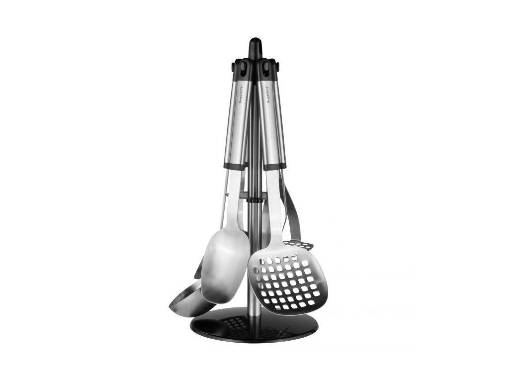 Táto súprava náradia so 6 kuchynskými pomôckami z nehrdzavejúcej ocele a 2 praktickými stojanmi na jednoduché skladovanie je nevyhnutnosťou v každej kuchyni. Vďaka stojanom neplytváte cenným priestorom v zásuvkách a máte na dosah 6 najdôležitejších kuchynských pomôcok, ktoré vám uľahčia každodenné varenie. Čokoľvek máte na jedálnom lístku, servírovacia lyžica, polievková naberačka, vidlička na mäso, drvič na zemiaky, lopatka a skimmer vám poskytnú všetku pomoc, ktorú potrebujete na vykúzlenie lahodného jedla!