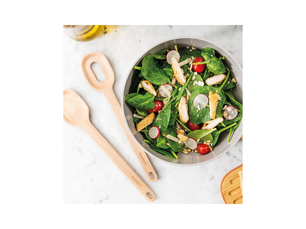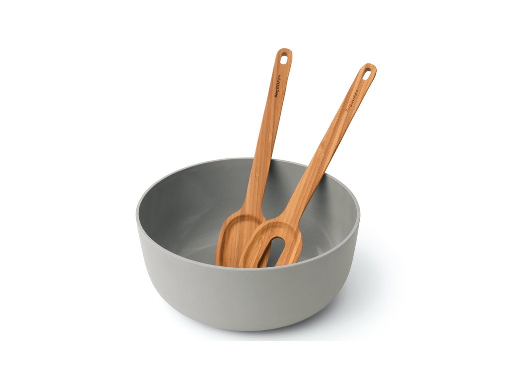 Bambusová sada na šalát, ktorá sa skladá z veľkej sivej misy a dvomi praktickými naberačkami na miešanie a naberanie. Bambusové drevo veľmi rýchlo rastie a preto sa radí medzi obnoviteľné zdroje. Zároveň je prirodzene antibakteriálny a absorbuje veľmi malú vlhkosť, takše je hygienickejší ako niektoré iné druhy dreva.