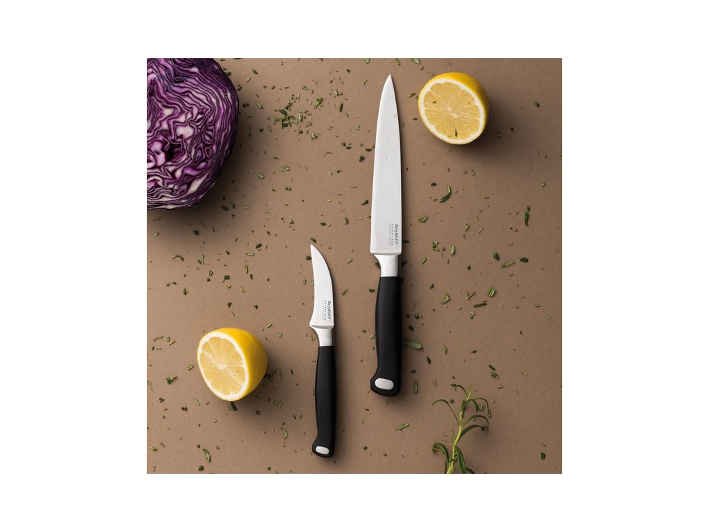 Nástupca ikonickej série Gourmet line. Uľahčite si lúpanie ovocia a zeleniny lúpacím nožom. Má zahnutú ručne brúsenú čepeľ z nehrdzavejúcej ocele a ergonomicky tvarovanú rukoväť. Nôž je vyvážený, aby sa vám dobre bezpečne držal a ľahko sa s ním pracovalo.