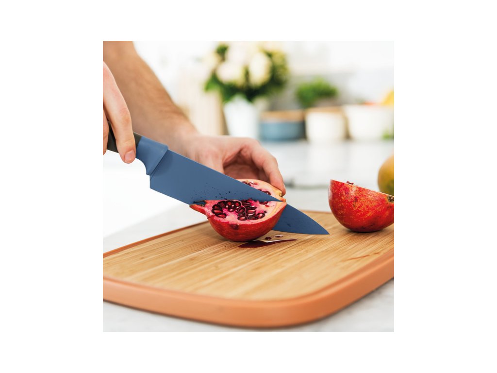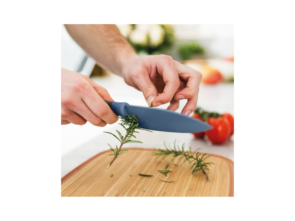 Ideálny pomocník pri krájani vašich obľubených byliniek. Kvalitný oceľový nôž v modrom prevedení s non-stick povrchom z línie LEO od uznávaného dizajnéra PIETER ROEX.