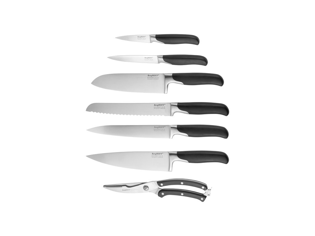 Aj obyčajná kuchyňa môže skrývať niekoľko profesionálov v podobe tejto sady nožov, v modernom stojane v čiernej matnej farbe. Sedem vyvážených, ručne brúsených nožov z nehrdzavejúcej ocele vás presvedčia o tom, že krájanie, sekanie, vyrezávanie, vykosťovanie a porcovanie je pre ne ľahká a bezpečná úloha. V stojane nájdete aj porcovacie nožnice na hydinu. O pohodlie sa postarajú ergonomicky tvarované rukoväte z pevného ABS plastu. Celá sada vyzerá ako jeden dizajnovo nadčasový kúsok, ktorý vám poslúži na dlhé dlhočizné roky.