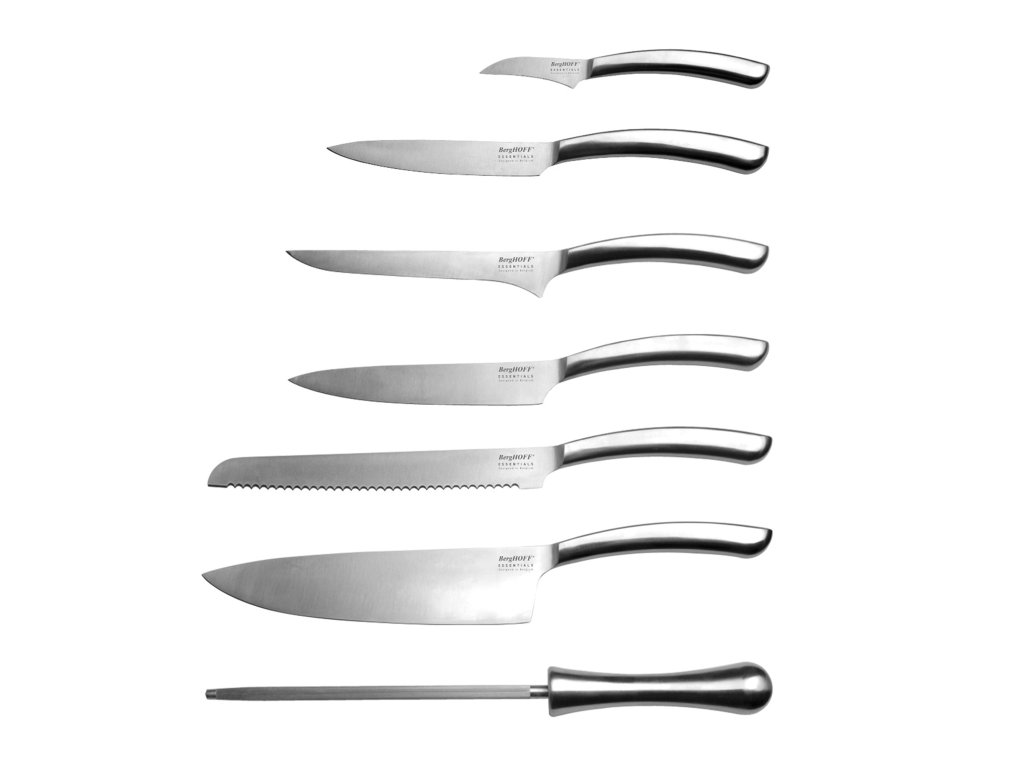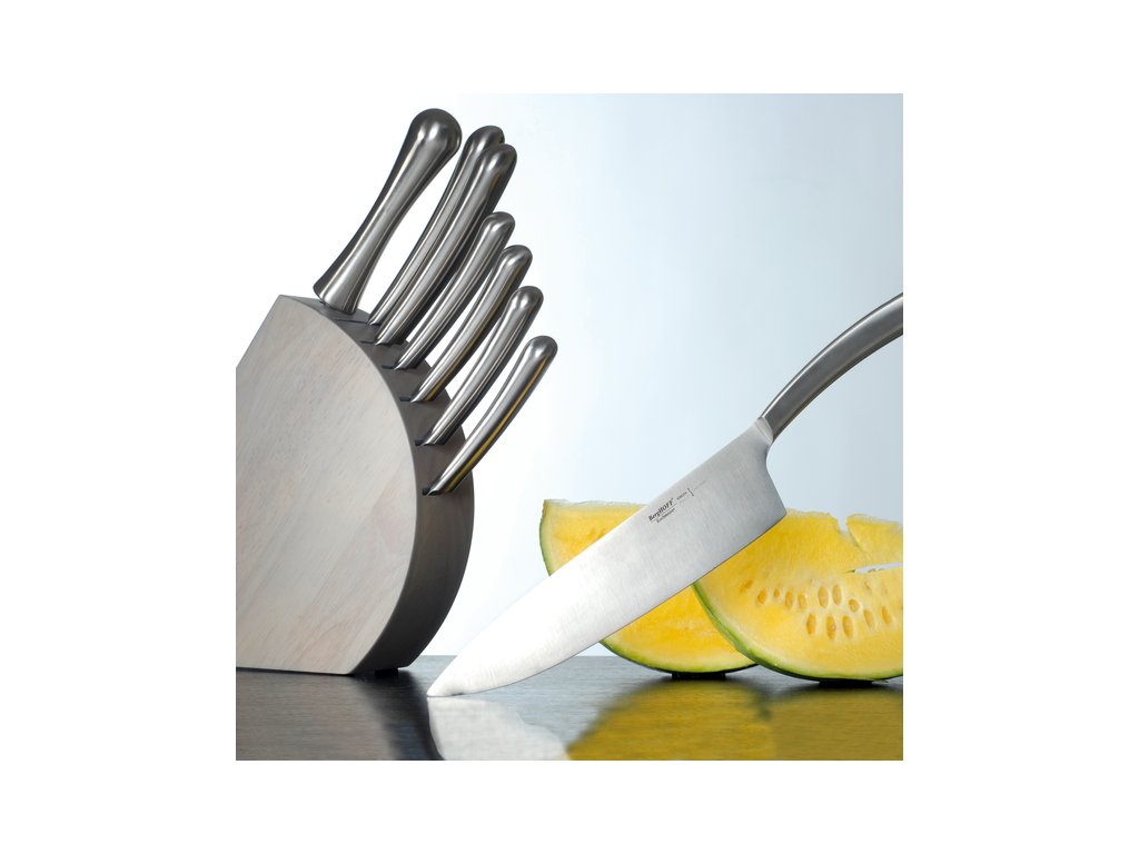 Sada šiestich nožov a ocieľky v praktickom stojane. Nože majú ručne brúsené čepele. Nože sú vyrobené z vysoko kvalitnej chróm-molybdén-vanádiovej ocele (x50CrMoV15), šedý drevený blok na nože má protišmykovú základňu.