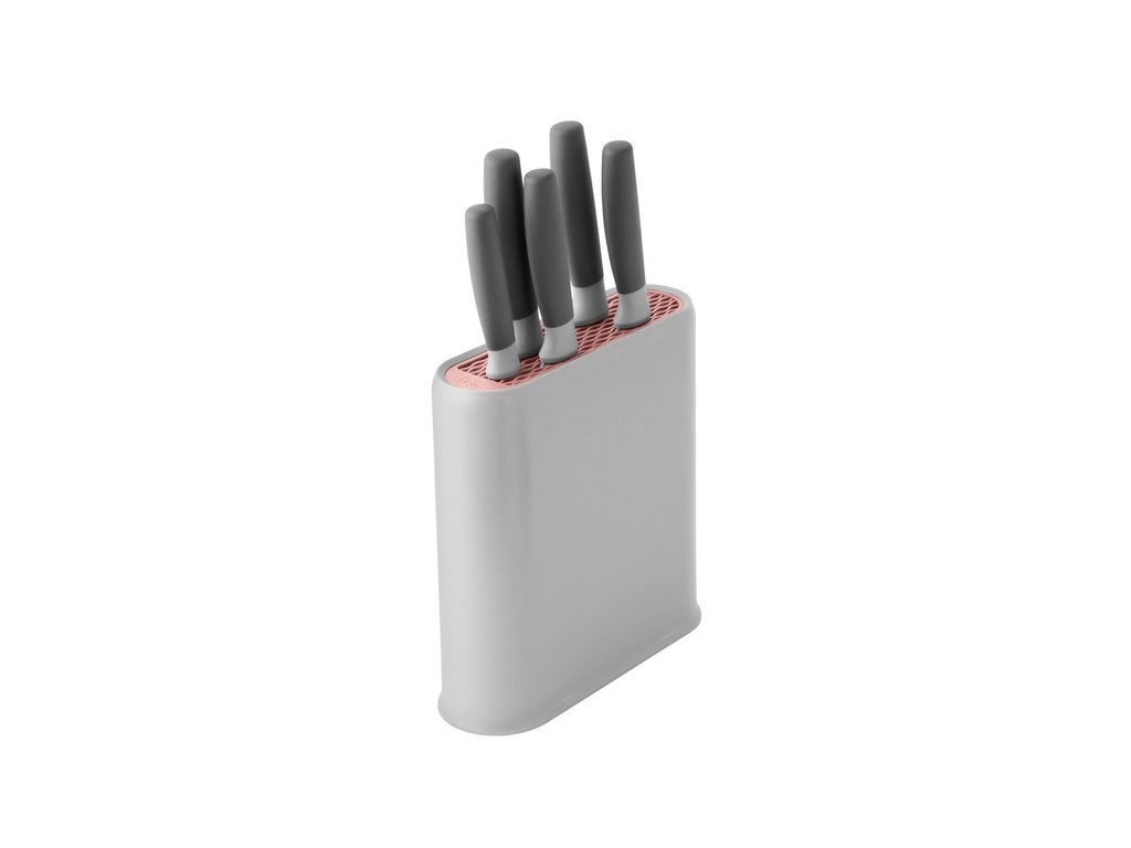 Stavte na poriadne nože, ktoré vám uľahčia prácu v kuchyni. Teraz ich môžete mať vždy po ruke a upratané na jednom mieste. Tento set obsahuje stojan a 5 nožov. Stojan má protišmykovú základňu a vnútornú vyberateľnú vložku, aby sa lepšie udržovala čistota stojana. Vložky na nože sú v dvoch farbách a tak si môžete navoliť svoj vlastný dizajn stojana, ktorý sa hodí do vašej kuchyne. Ergonomicky tvarované a dobre vyvážené nože s čepeľami z tvrdej ocele a rúčkami z mäkkého polypropylénu, vďaka čomu vám nevykĺznu len tak z rúk.