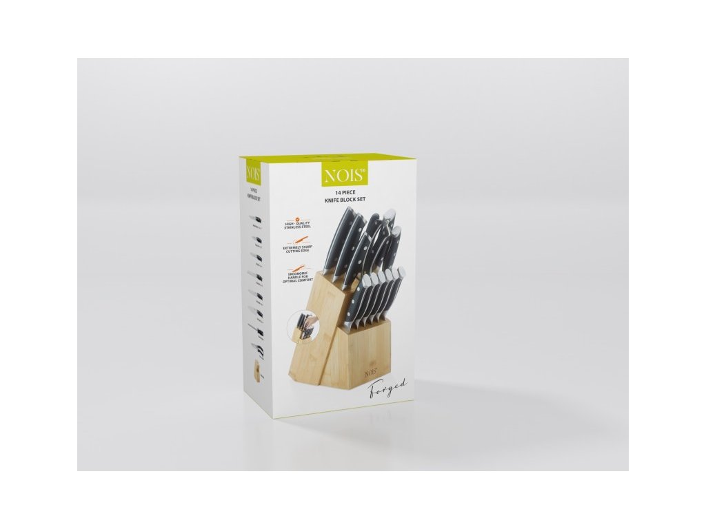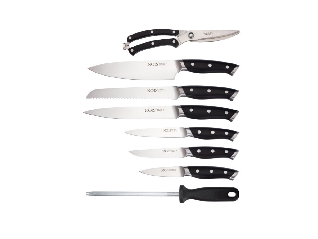 Sada FORGED od "NOIS" pozostáva z praktických a štýlových nožov, ktoré vám pomôžu pripraviť chutné raňajky, obed aj večeru. Nože sú vyrobené z valcovanej nerezovej ocele X30CR13 (obsahujúcej 13% chrómu) s tvrdosťou 52 +/- 2 HRC. Dizajn a tvar noža zaisťujú jednoduché používanie. Ostrá a tenká čepeľ ľahko prerežě produkty rôznej tvrdosti. Hladký, starostlivo leštený povrch čepele umožńuje presné rezanie bez deformácie výrobkov. V mieste, kde sa čepeľ stretáva s rukoväťou, sa nehromadia baktérie a nečistoty. Zhrubnutie medzi čepeľou a rukoväťou noža poskytuje bezpečnú oporu pre ukazovák a tiež zlepšuje rovnováhu, čo umožńje dlhú prácu bez únavy. Tieto nože sa ľahko brúsia.