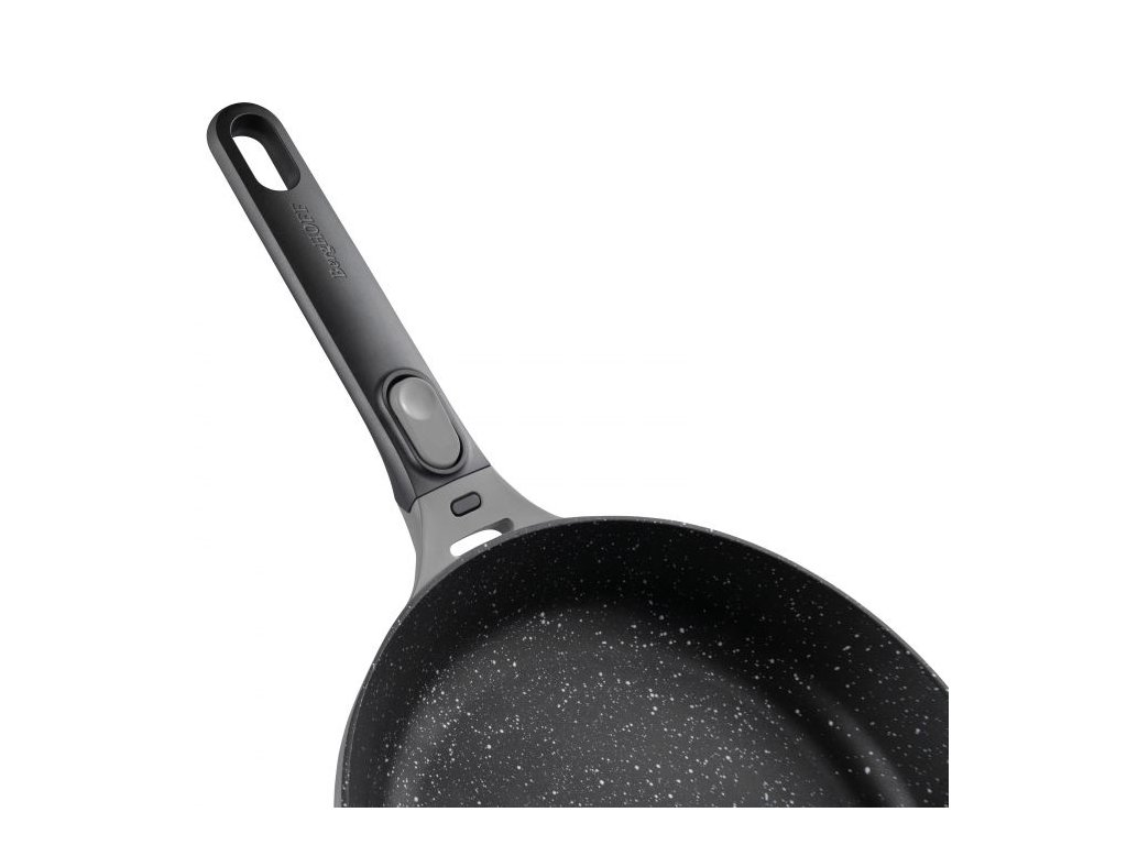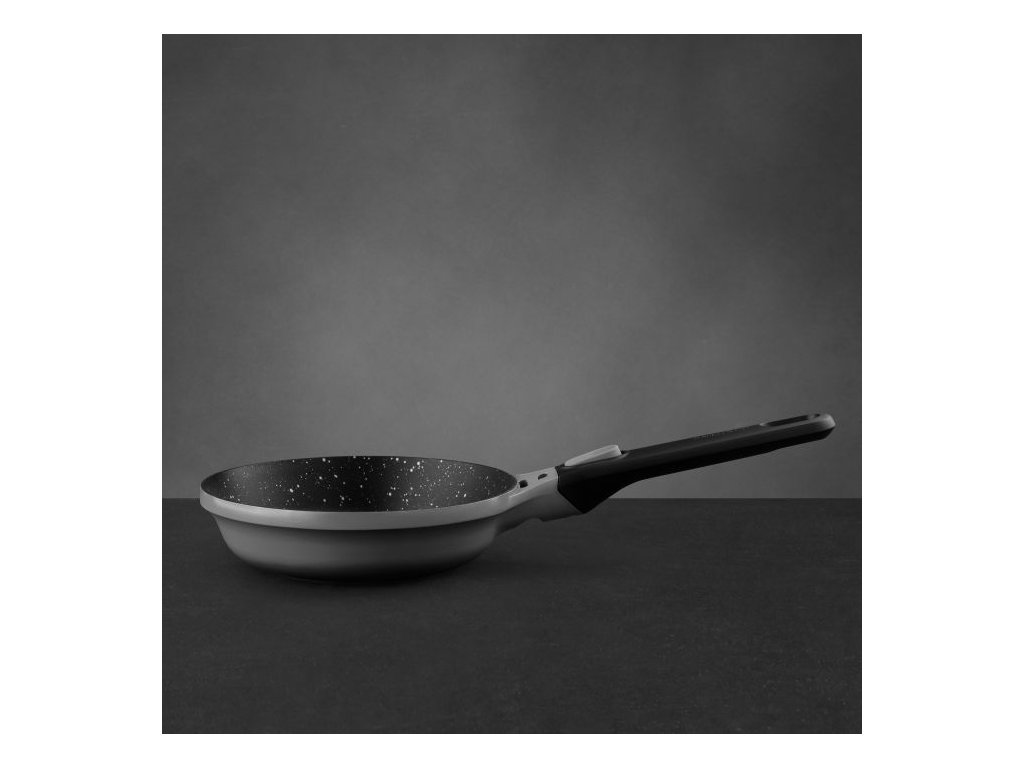 Omeleta z dvoch vajec na raňajky, malá frittata na obed alebo rybie filé na večeru, s touto 20 cm panvicou vypražíte jedlo k dokonalosti kedykoľvek počas dňa. Hliníkové telo zaisťuje rýchlu a rovnomernú distribúciu tepla na akomkoľvek druhu varnej dosky vrátane indukcie a je vybavené viacvrstvovým nepriľnavým povrchom, ktorý umožňuje varenie s nízkym obsahom tuku, ako aj jednoduché čistenie. Chcete umiestniť panvicu do rúry alebo ušetriť cenný úložný priestor? Jednoducho odnímte odnímateľnú rukoväť a môžete vyraziť!