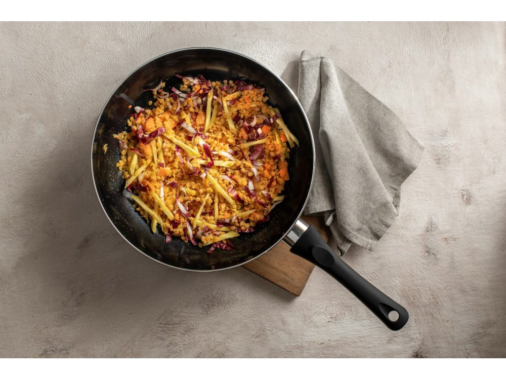 S touto hliníkovou panvicou od spoločnosti Sola môžete pohodlne variť, smažiť, opekať. Mäkká rukoväť padne pohodlne do ruky a vďaka keramickému nepriľnavému povrchu môžete pripraviť pokrmy s menším množstvom oleja. Panvica je vhodná pre všetky zdroje tepla a je tepelne odolná do 160°C. Vysoké zahnuté okraje panvice zabránia, aby vám príprava surovín z nej len tak nevykĺzla. Súčasťou panvice je aj sklenená pokrievka s parným otvorom, cez ktorú môžete mať kontrolu nad prípravou pokrmu.
