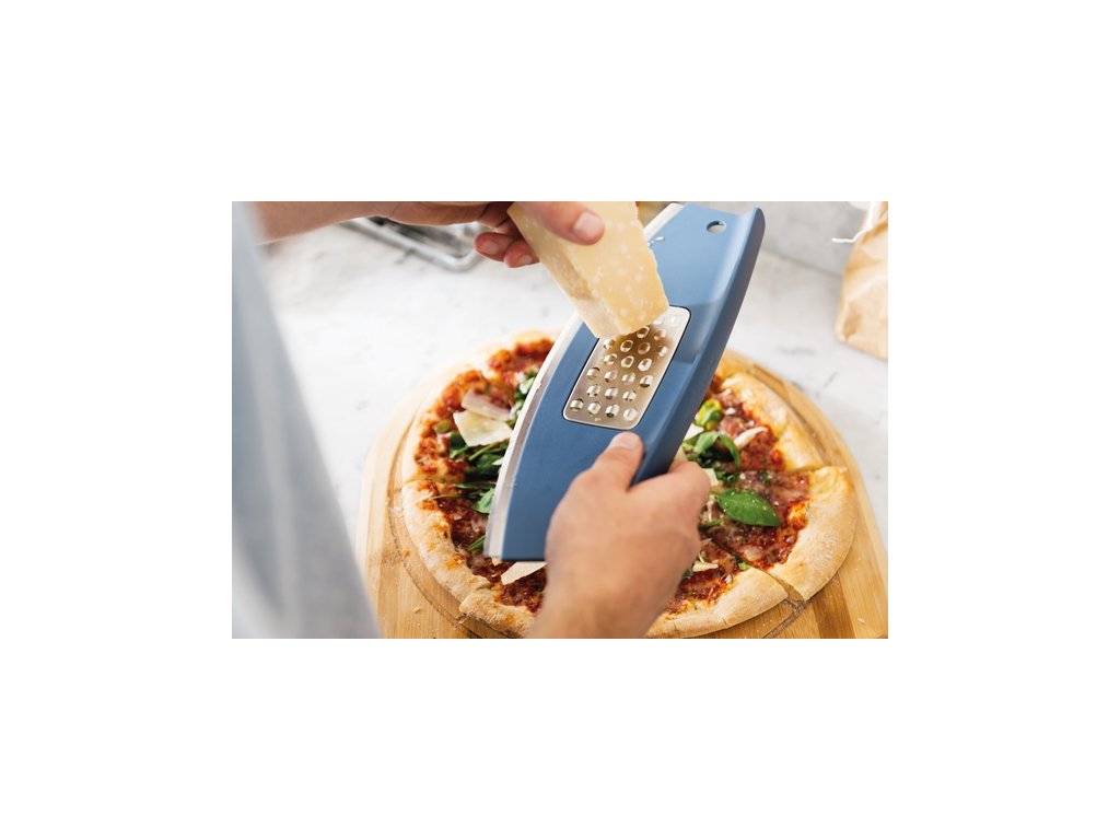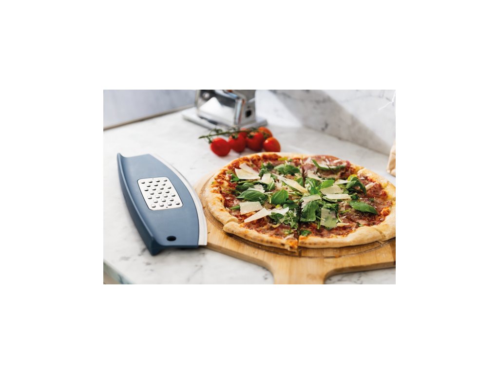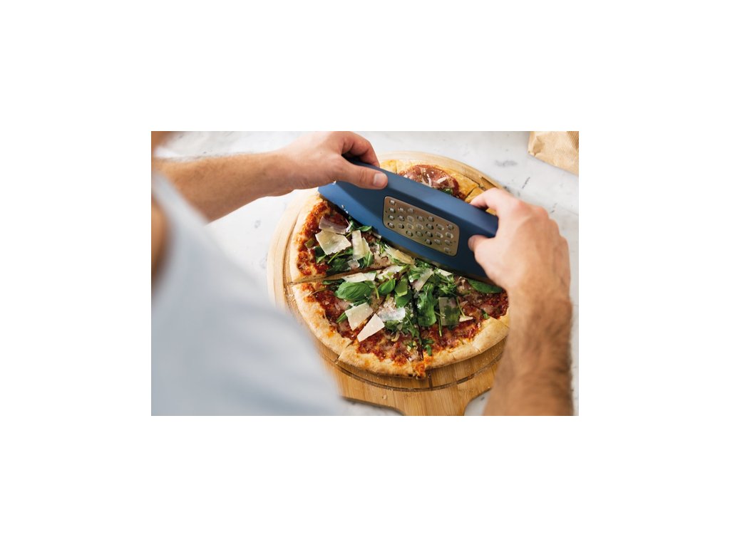Dve funkcie v jednom šikovnom nástroji, ktorý dopomôže k výrobe vašej vlastnej pizze. Je to ostrý oceľový pizza krájač s integrovaným strúhadlom na syr. Nakrájate s ním aj najhrubší okraj vašej upečenej pizze. Už sa vám zbiehajú slinky? No, ale nezabudnite sa podeliť.