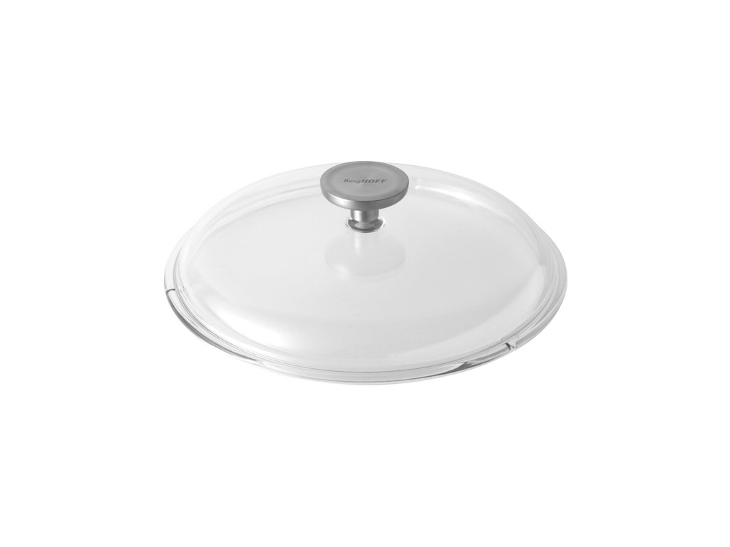 Kvalitná pokrievka na hrnce, ktorá je vyrobená z masívneho žiaruvzdorného borosilikátového skla. Má ľahko uchopiteľnú rukoväť z nerezovej ocele s logom značky na vrchu.