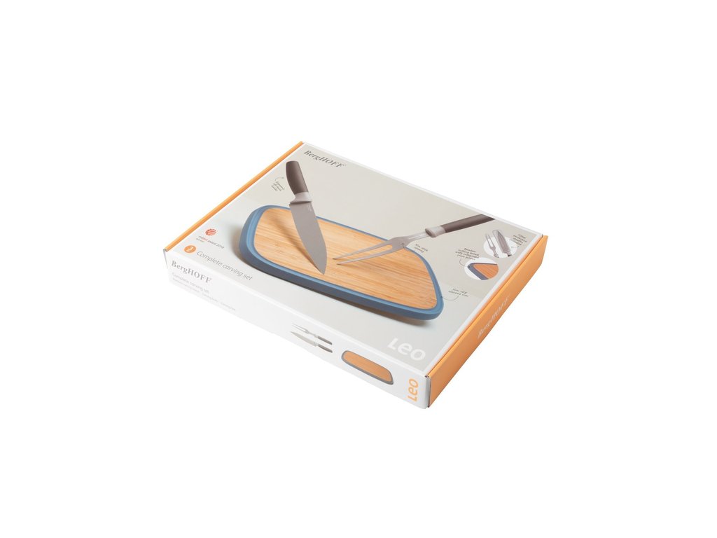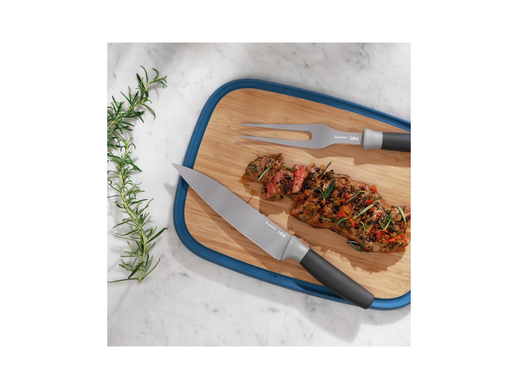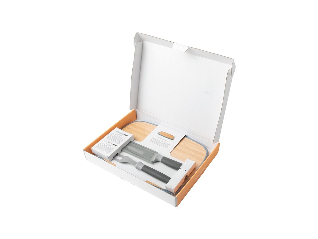 Sada zložená z ostrého porcovacieho noža z tvrdej nerezovej ocele, vidličky s dvomi zubami, ktoré vám pomôžu zachytiť mäso, aby nevykĺzlo a dosky. Oba nástroje majú ergonomicky tvarované a mäkké rúčky, s ktorými sa vám ľahko bude pracovať.