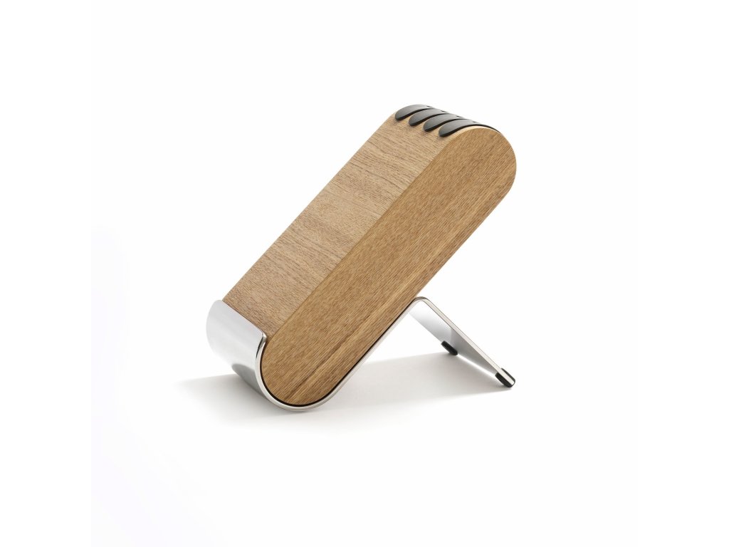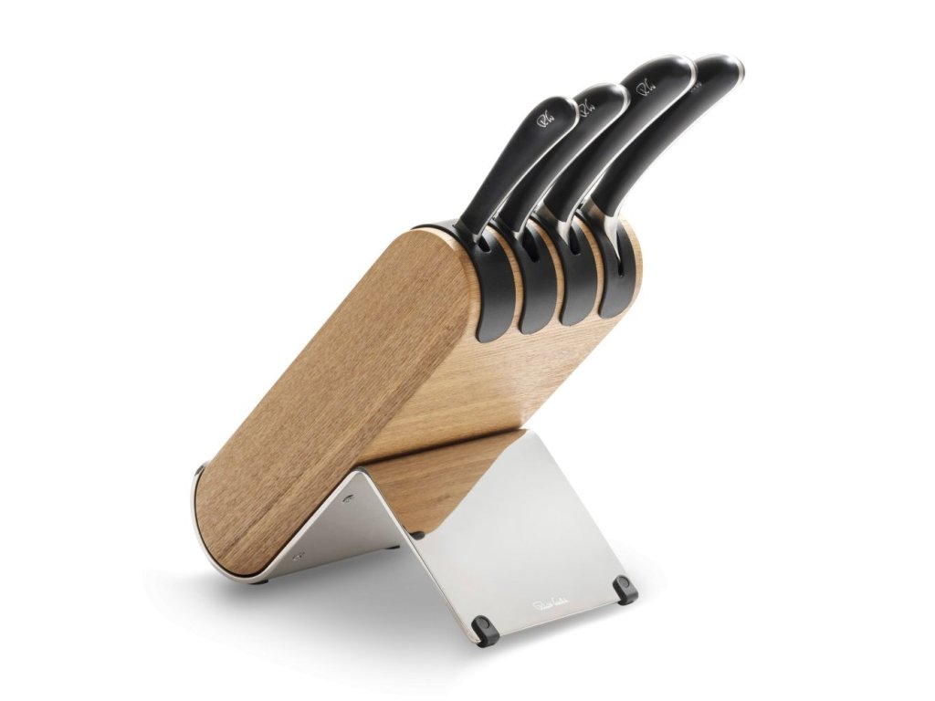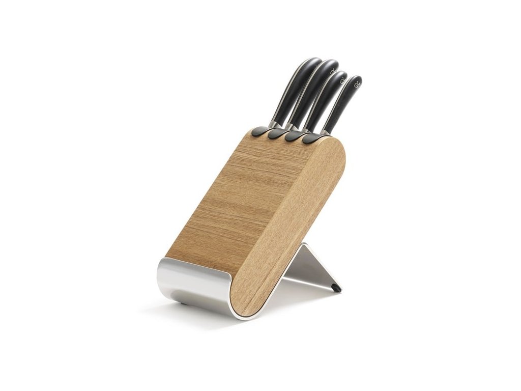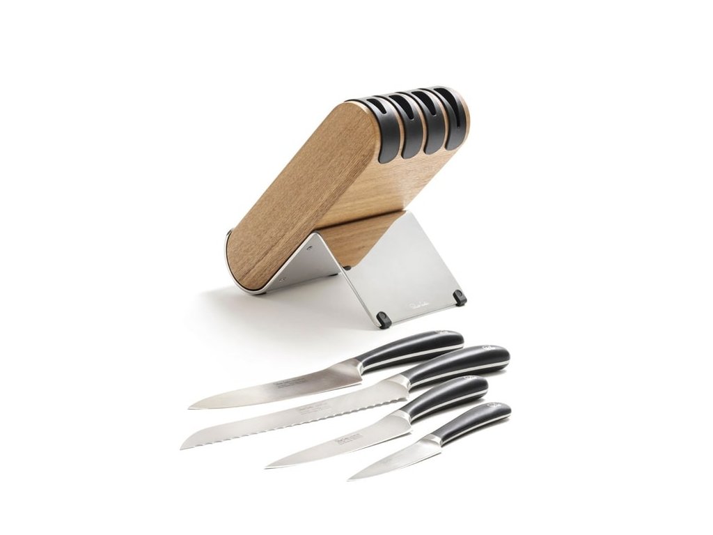 Dizajnový skvost v podobe tejto sady nožov v drevenom bloku z jaseňa. Blok má v sebe 4 štrbiny z pevného ABS plastu, ktoré majú naviac magnety, ktoré zabránia pri vysúvaní a zasúvaní nožov oderu čepele. Inovatívny dizajn bloku dopĺňa stojan z nehrdzavejúcej ocele. Sada obsahuje 4 základné nože, ktoré boli navrhnuté profesionálnymi kuchármi. Sú vyrobené z plne kovanej nemeckej nehrdzavejúcej ocele DIN 1.4116. Okraje čepele v japonskom štýle sú ručne nanášané v uhle 15 °. Rukoväte sú vyrobené z hmatového materiálu DuPont a sú ergonomicky tvarované pre pohodlie, vyváženie a minimalizáciu únavy. Celá sada je nápadným a praktickým doplnkom do modernej domácnosti.