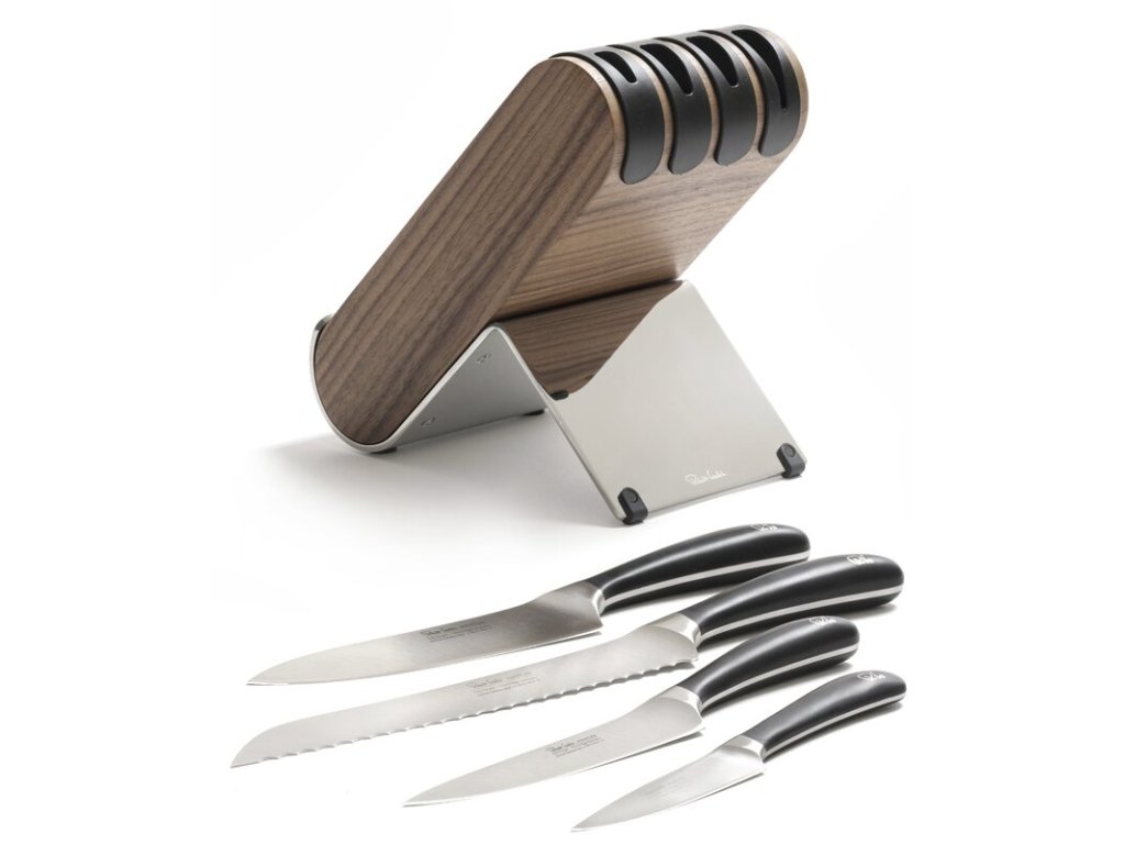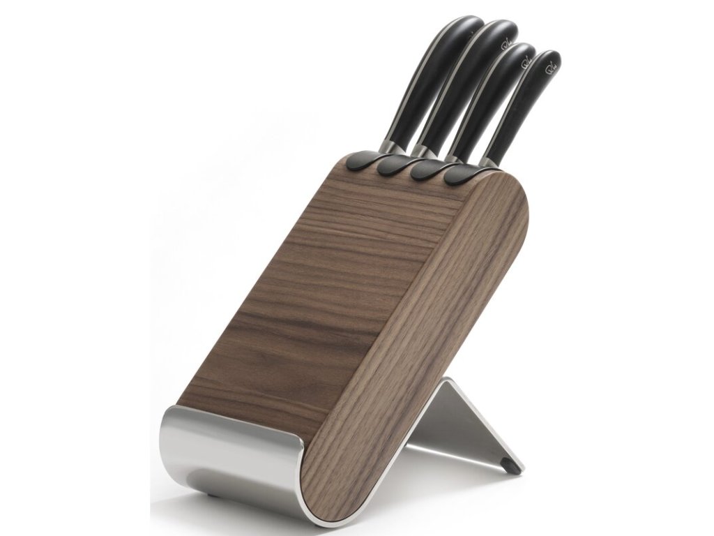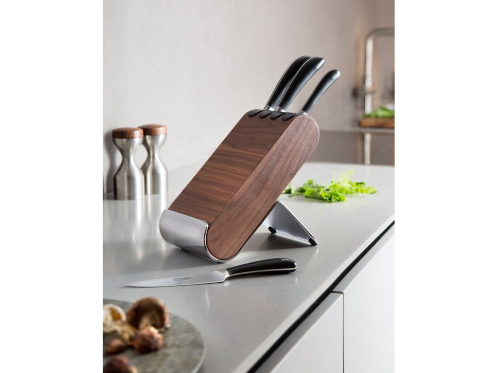 Dizajnový skvost v podobe tejto sady nožov v drevenom bloku z orecha. Blok má v sebe 4 štrbiny z pevného ABS plastu, ktoré majú naviac magnety, ktoré zabránia pri vysúvaní a zasúvaní nožov oderu čepele. Inovatívny dizajn bloku dopĺňa stojan z nehrdzavejúcej ocele. Sada obsahuje 4 základné nože, ktoré boli navrhnuté profesionálnymi kuchármi. Sú vyrobené z plne kovanej nemeckej nehrdzavejúcej ocele DIN 1.4116. Okraje čepele v japonskom štýle sú ručne nanášané v uhle 15 °. Rukoväte sú vyrobené z hmatového materiálu DuPont a sú ergonomicky tvarované pre pohodlie, vyváženie a minimalizáciu únavy. Celá sada je nápadným a praktickým doplnkom do modernej domácnosti.