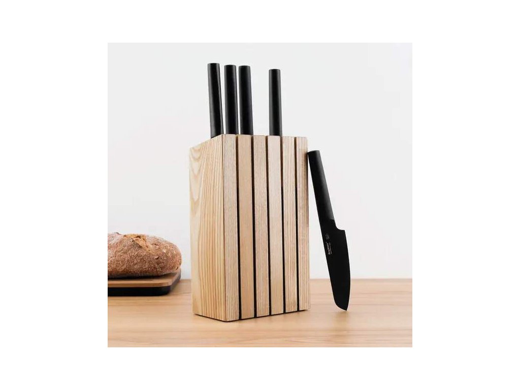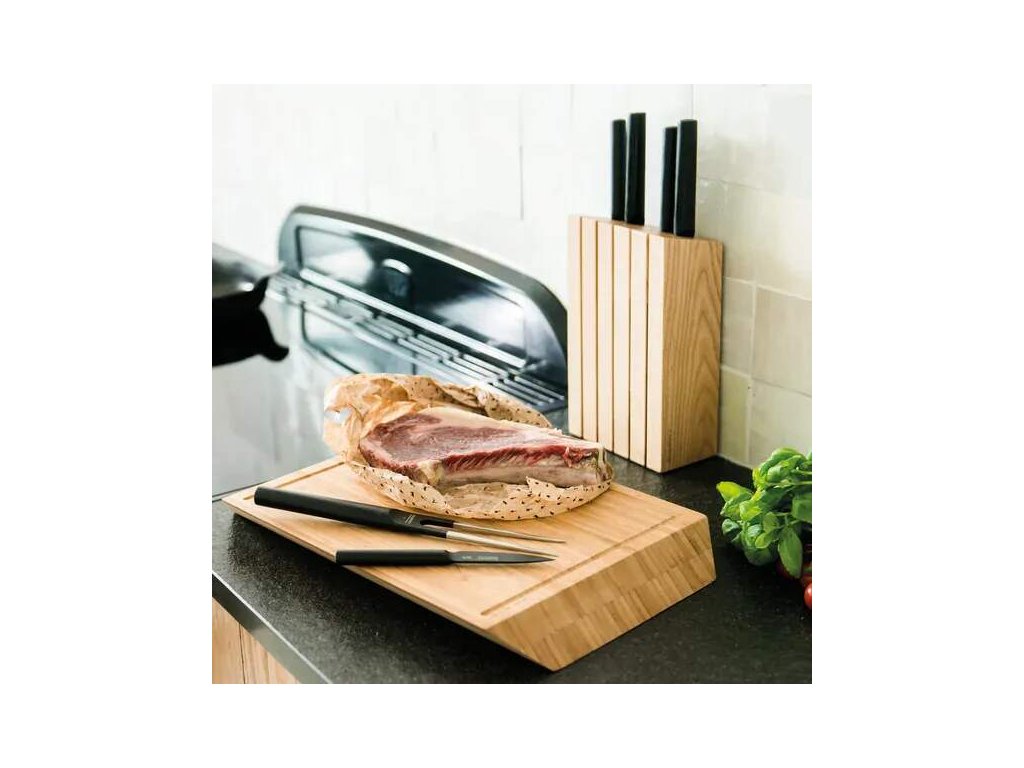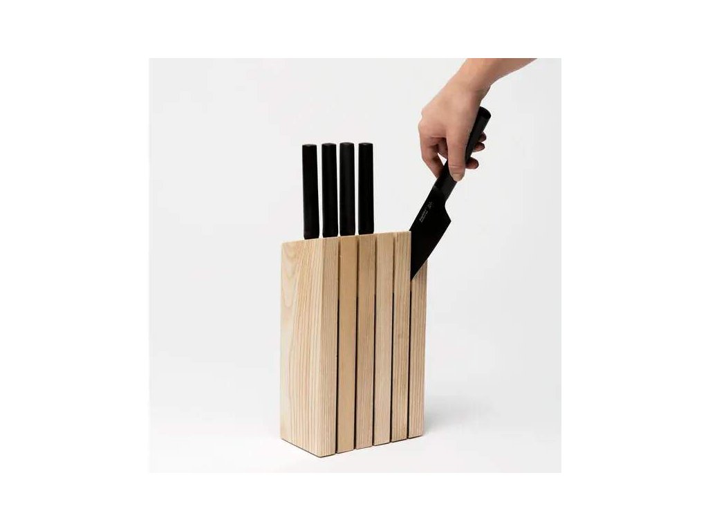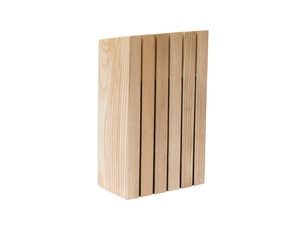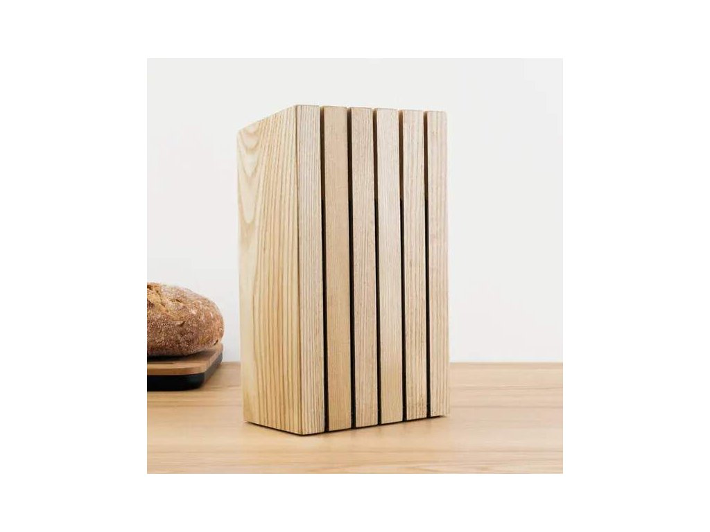 Drevený nábytok a drevené doplnky patria k nadčasovým dizajnovým prvkom, preto ak zvolíte drevený stojan, verte, že urobíte dobre. Tento stojan je z jaseňového dreva, má skosený vrch, 5 zarážok na nože a spodná časť je protišmyková.