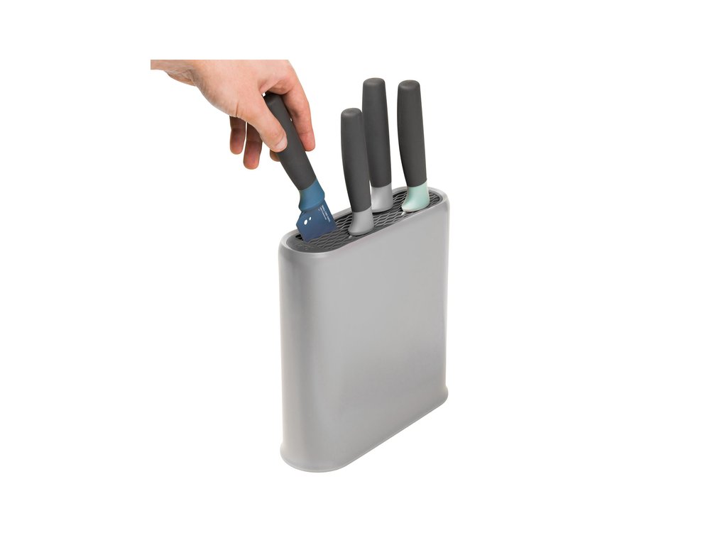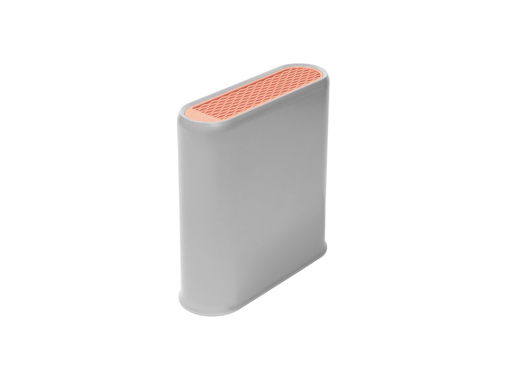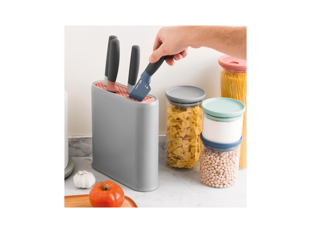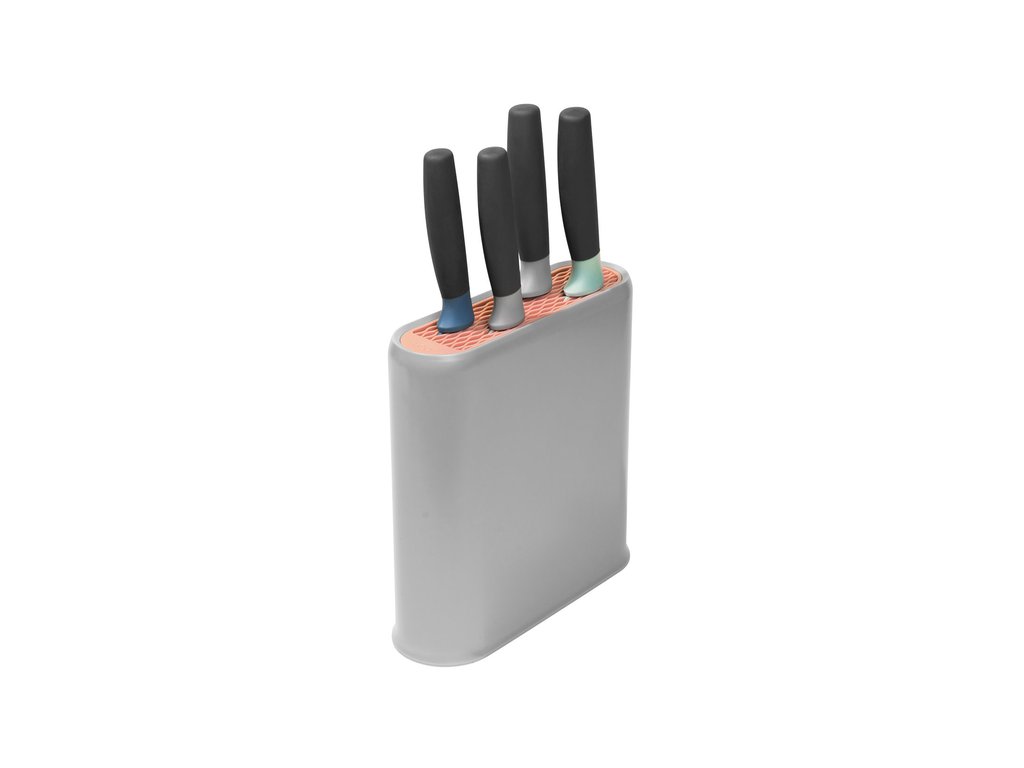 Majte nože vždy po ruke a upratané na jednom mieste. Nadčasový dizajn tohto stojana sa o to postará. Má protišmykovú základñu a vnútorna vložka je vyberatełná, aby sa lepšie udržovala čistota stojana. Vložky na nože sú v dvoch farbách a tak si môžete navoli&soft; svoj vlasný dizajn stojana, ktorý sa hodí do vášej kuchyne. Stojan pojme 6-8 nožov.
